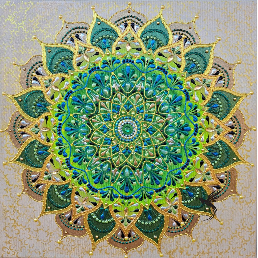 Stred mandaly – zelená farba symbolizuje nové začiatky, rast a vyváženosť. Je to farba života, liečivej sily a obnovy. Zelená tu predstavuje jadro, z ktorého vyrastá energia celého diela, tak ako zo semienka vyrastá silný strom.